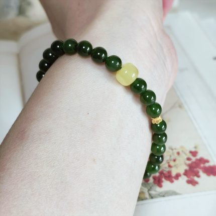 Natural Hetian Nephrite Jade Beaded Bracelet with Honey Amber —Harmony ·Vitality· Prosperity