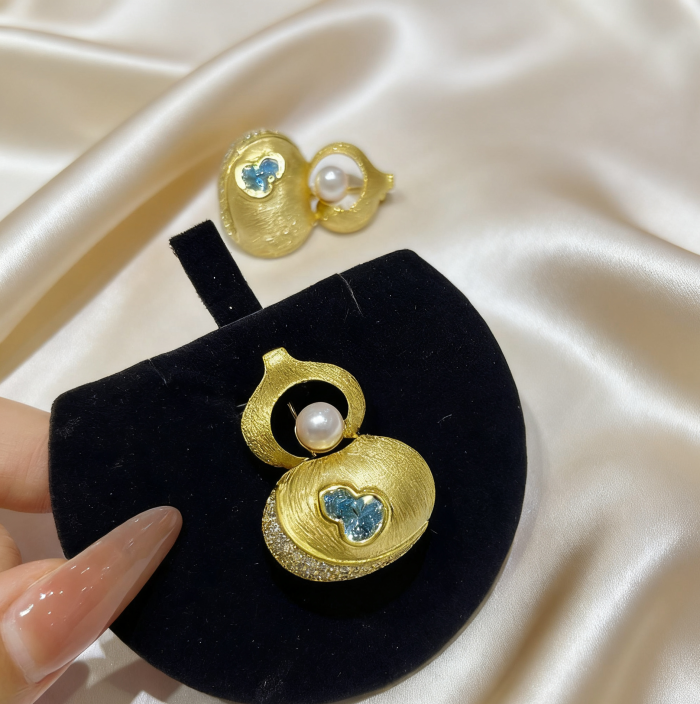 1.Design: Unique matte gourd design with dual-use functionality, blending Chinese aesthetic elements. The combination of Akoya pearl and blue cubic zirconia embodies luck and elegance, making it a distinctive statement piece.