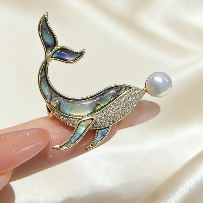 Home Brooch Pin Abalone Mother-of-Pearl Dolphin Brooch with Akoya Pearl – Ocean Elf Whimsical Elegance