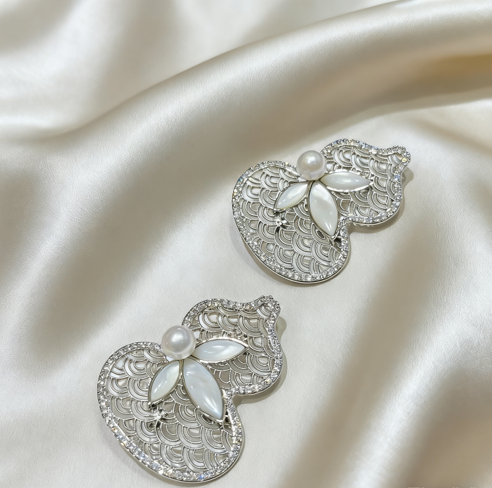 1. Design: Unique gourd design with intricate filigree details, mother-of-pearl accents, and a lustrous Akoya pearl, blending Chinese aesthetic elements. It’s a dual-use piece that symbolizes good fortune, adding a touch of exotic elegance to your look.